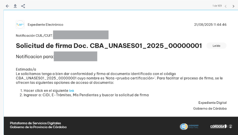 IMPORTANTE: desde el día en que se envió la notificación tendrás 30 días corridos para firmar el documento. Si el documento no es firmado dentro del plazo establecido el trámite se dará por desistido y será archivado.