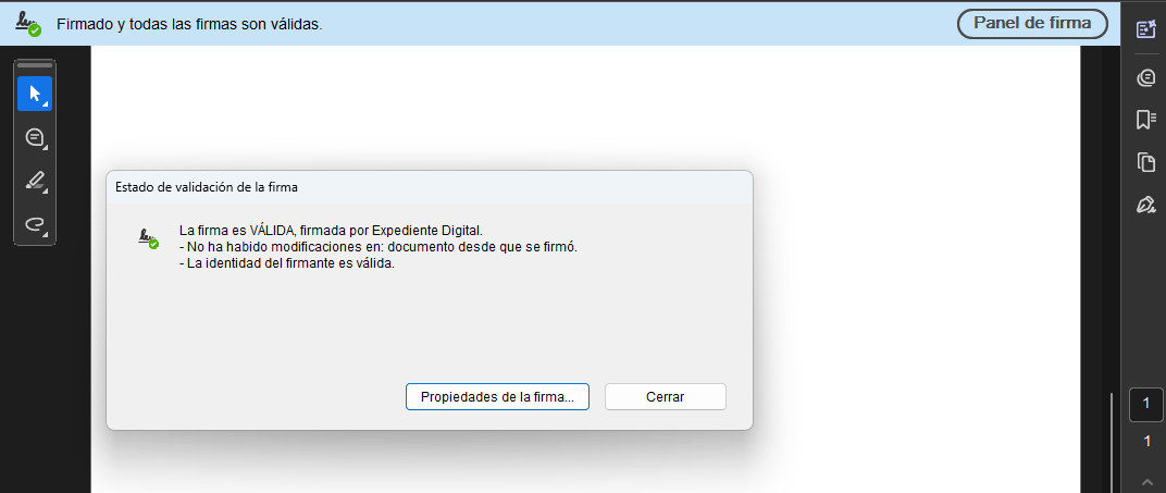 Desde el lector Adobe, al hacer clic en la firma digital, visualizarás el siguiente cartel: