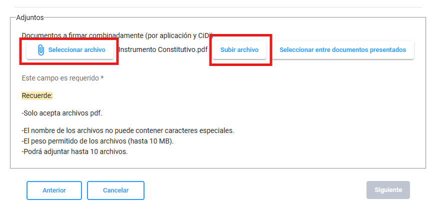 Para cargar los documentos primero deberás cliclear «seleccionar archivo» y luego «subir archivo»
