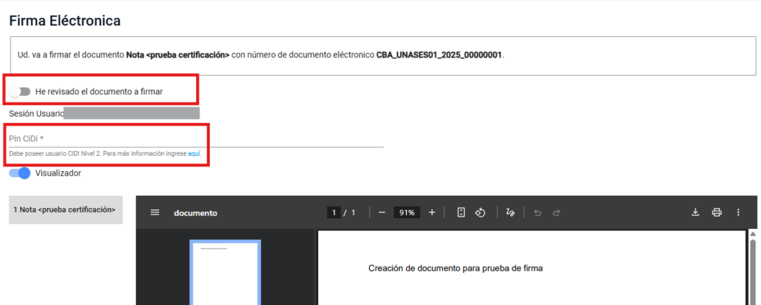 Una vez leído el contenido del archivo, tendrás que cliclear en “he revisado el documento a firmar” y luego poner el PIN de 4 números de CiDi: